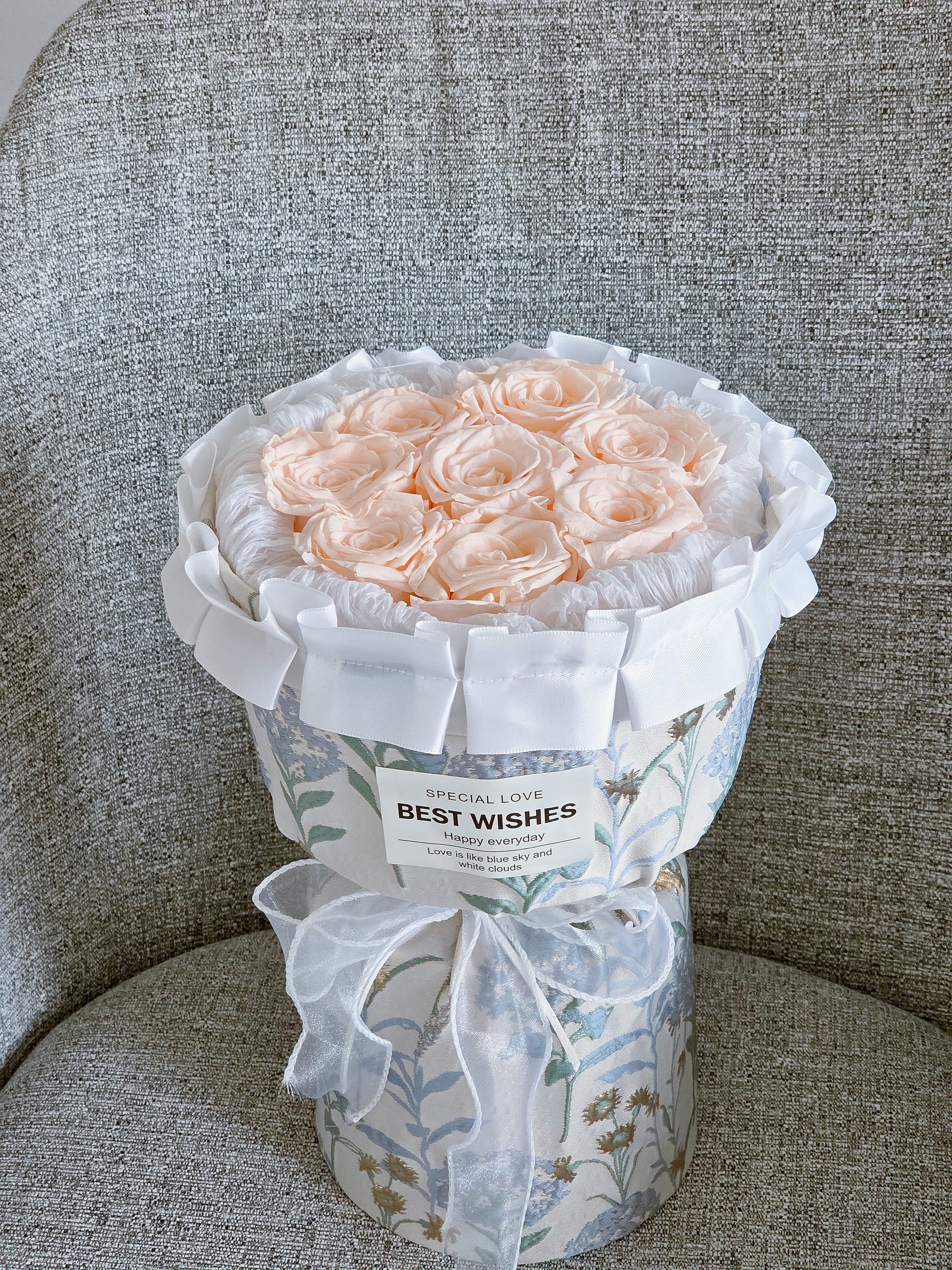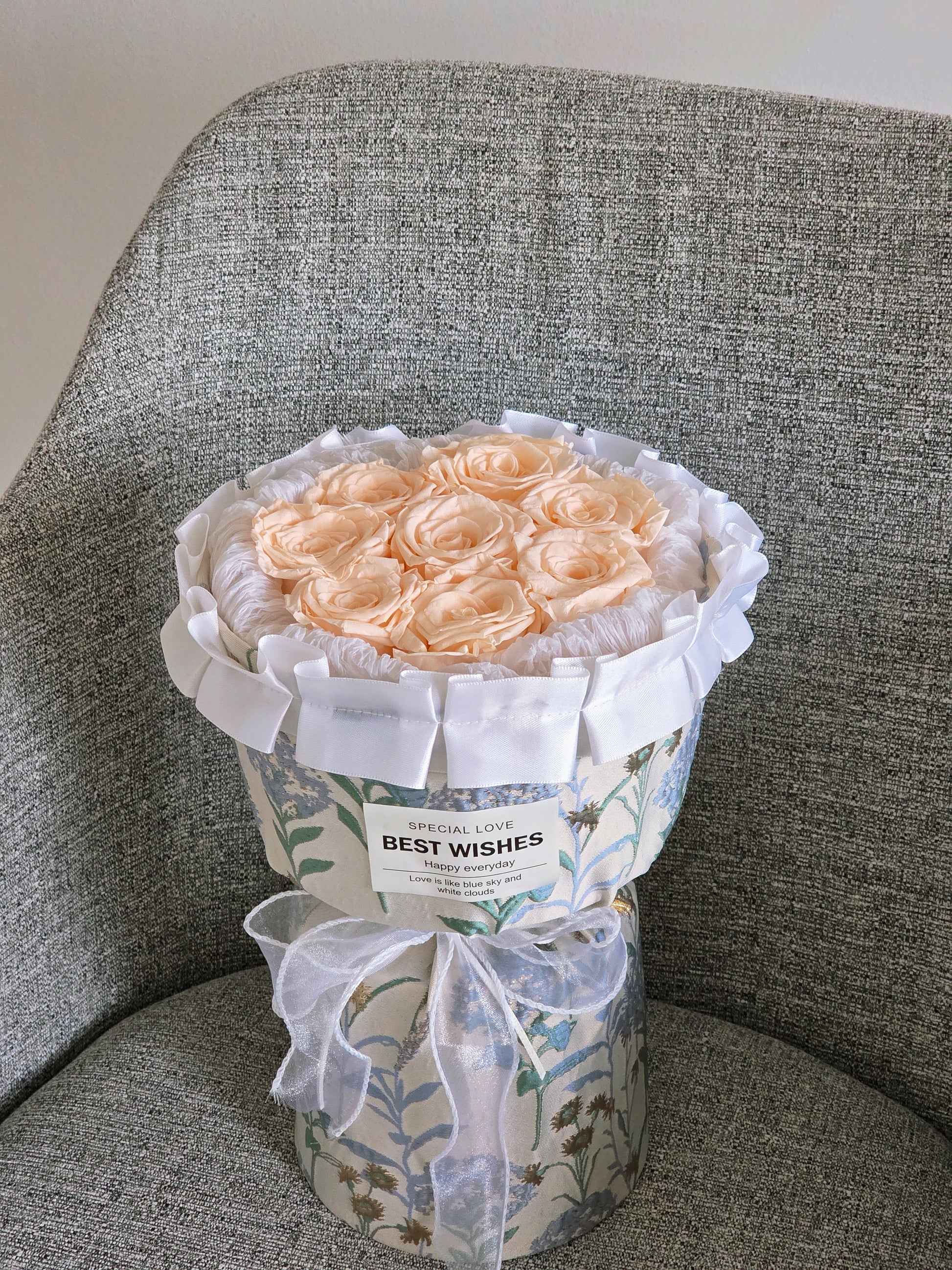 This elegant piece is composed of eight light yellow preserved roses, presented in timeless Chanel-inspired packaging. Chic and refined, it’s a gift that never goes out of style — perfect for expressing love, gratitude, or simply enjoying a touch of everyday luxury.